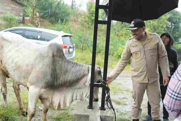 Pakpak Bharat | suaraburuhnasional.com – Bupati Pakpak Bharat, Franc Bernhard Tumanggor menyerahkan hewan qurban Gubernur Sumatera Utara ke Desa Penanggalan Binanga Boang, Kecamatan Salak. Ketua Badan Kemakmuran Masjid (BKM) Al Iman, Penanggalan Binanga Boang, Elson Angkat menerima langsung hewan qurban berupa satu ekor sapi ini.